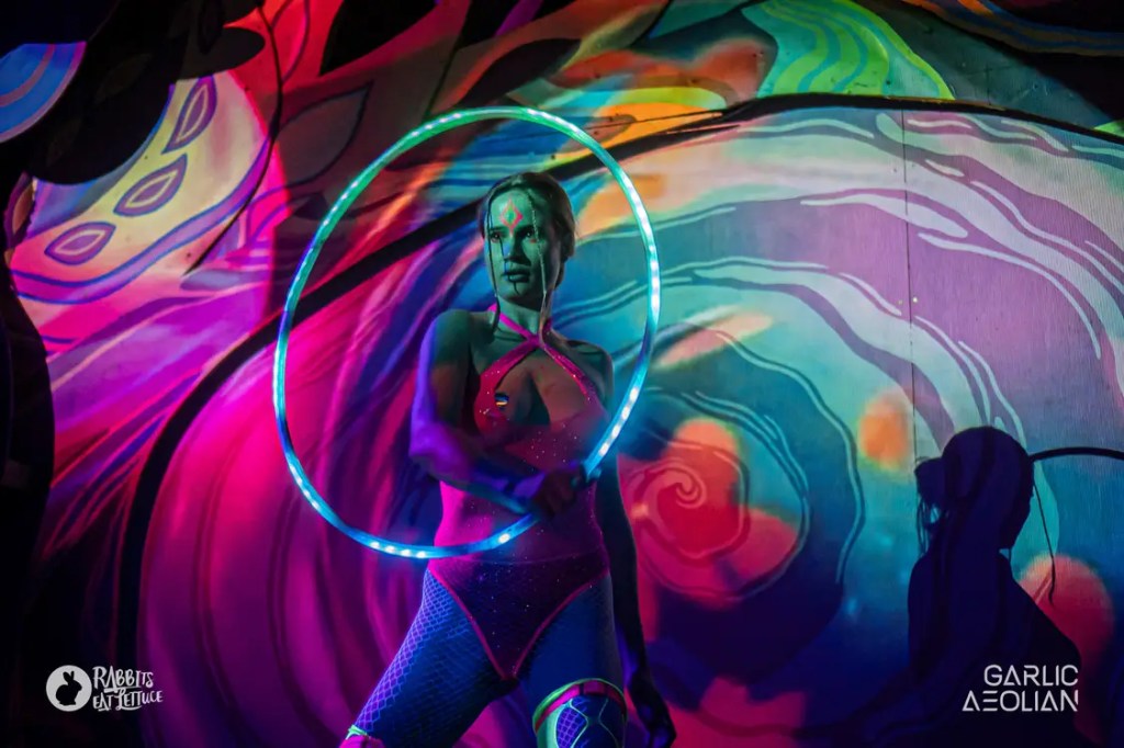 Available as a feature performance. Props include Hoop, Isis wings Silk fans, Silk Wings, Veil hoop, hoop and double hoop. We can also do UV aerials such as Lyra and Pole. Performer/s will come with their own UV lights and need access to a PowerPoint and dark space.